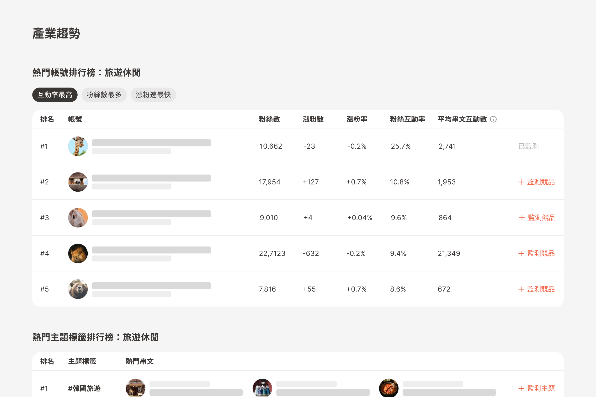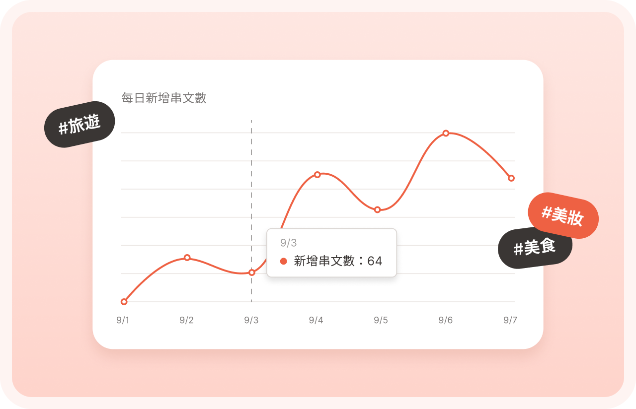 追蹤你感興趣的熱門主題標籤或關鍵字,分析主題效益,讓你的內容緊跟時事,增加曝光機會。