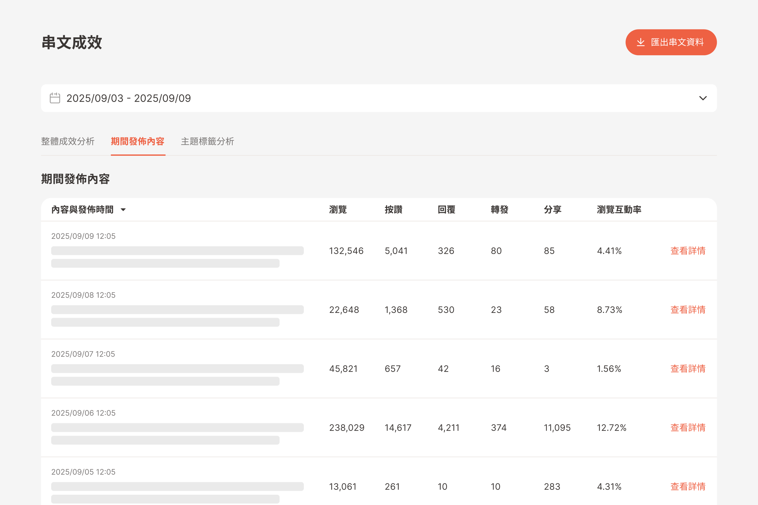 快速檢視所有發佈內容的成效,精準評估哪些內容真正打動了你的粉絲。