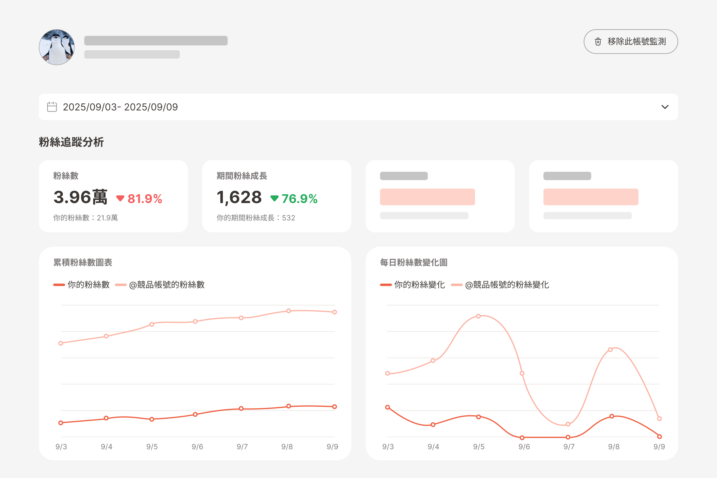 直接將你的帳號與競品進行一對一比較,從粉絲成長速度到內容互動率,精準找出你們之間的差距與優勢,讓超車之路不再是空想。