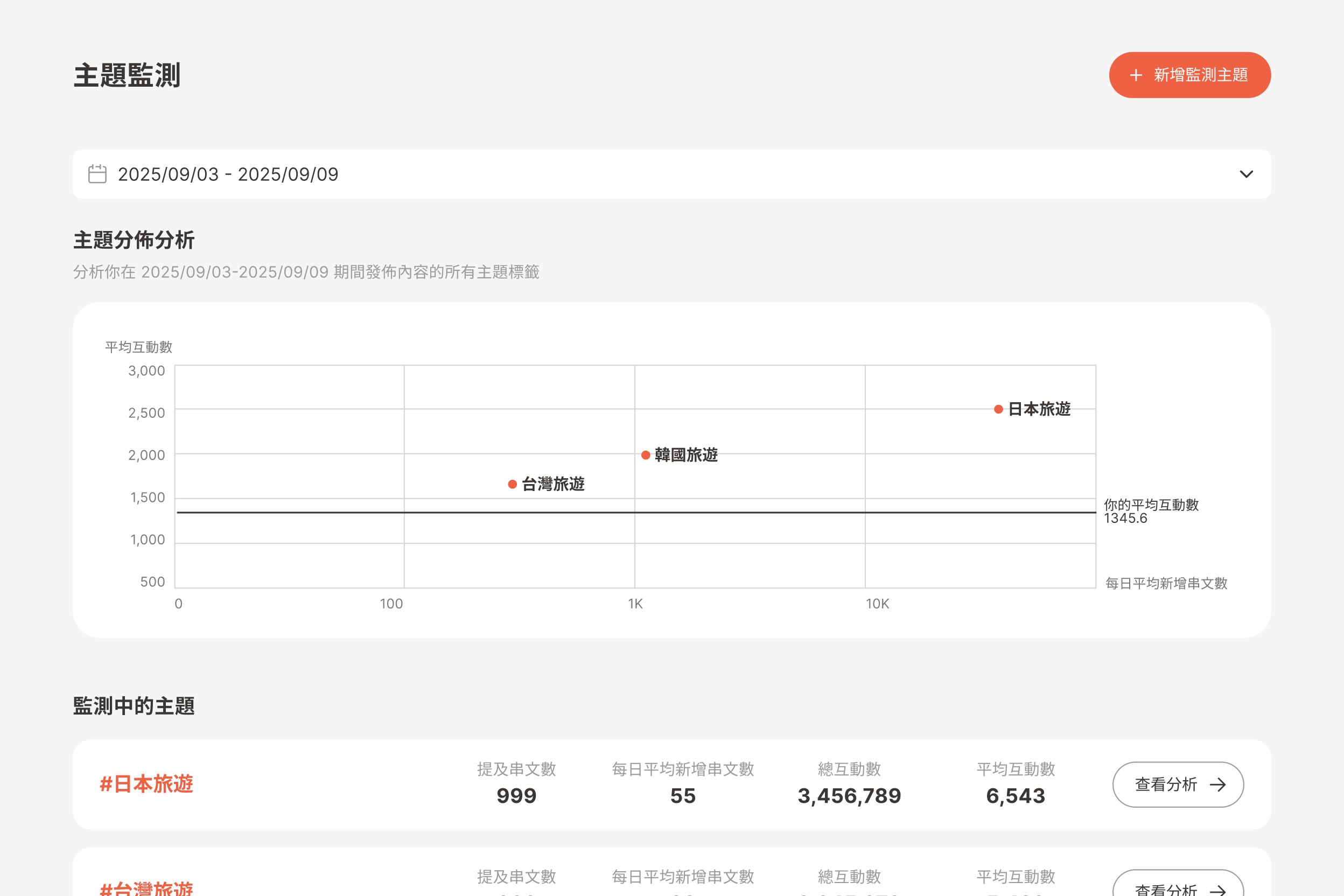 Knit 的「主題監測」功能能幫你追蹤特定主題或標籤的整體表現。你可以看到: